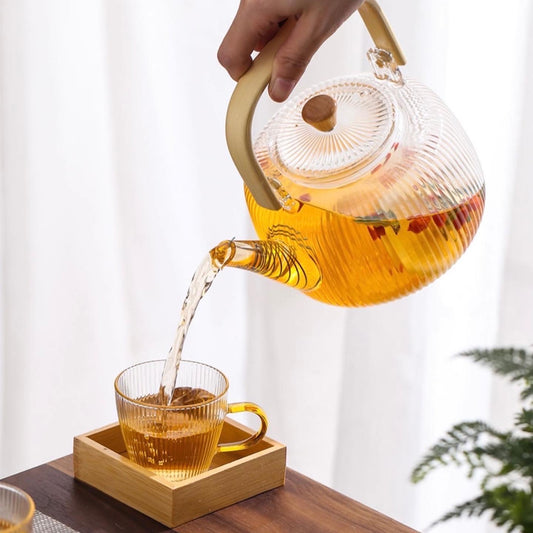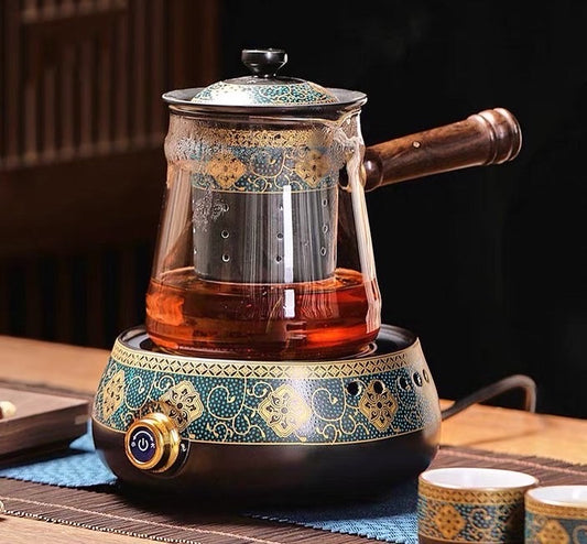 طقم شاي زجاجي مع موقد كهربائي ملون