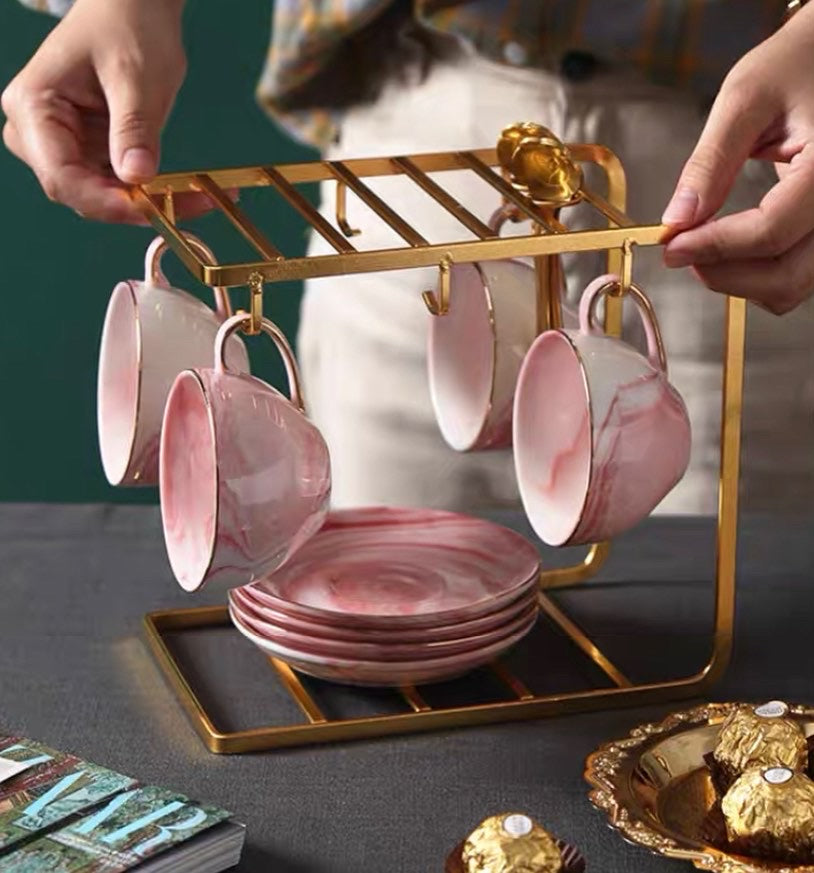 British afternoon tea , luxury, pink flower tea set , set includes (teapot , candle heating base , 6 cups , 6 sausers , 6 spoons, ceramic tray , metal cups holder )
