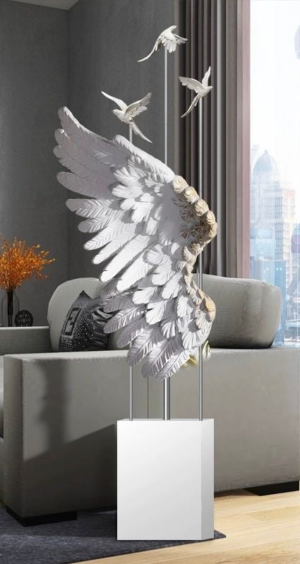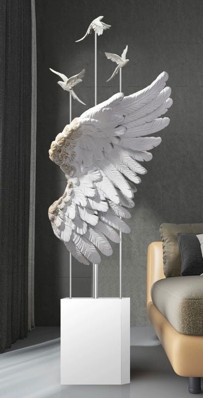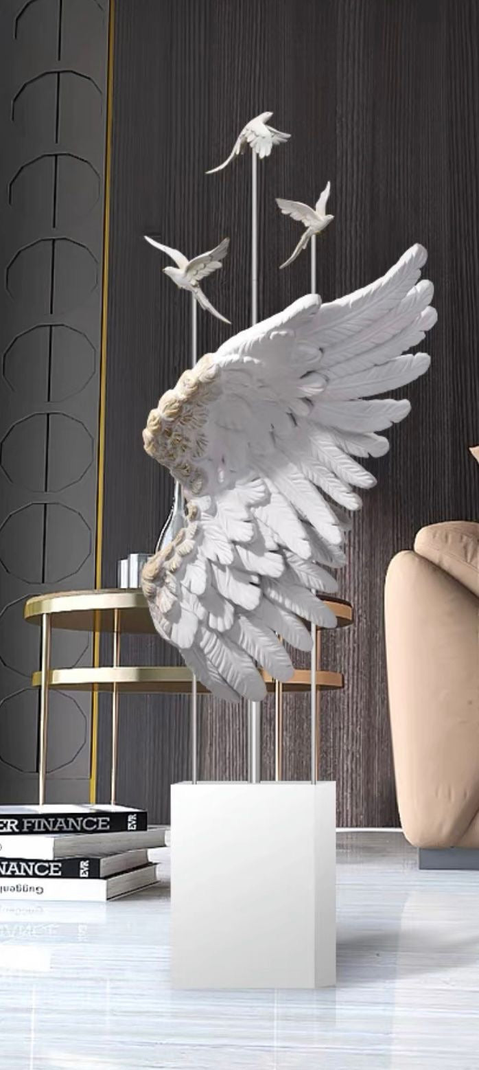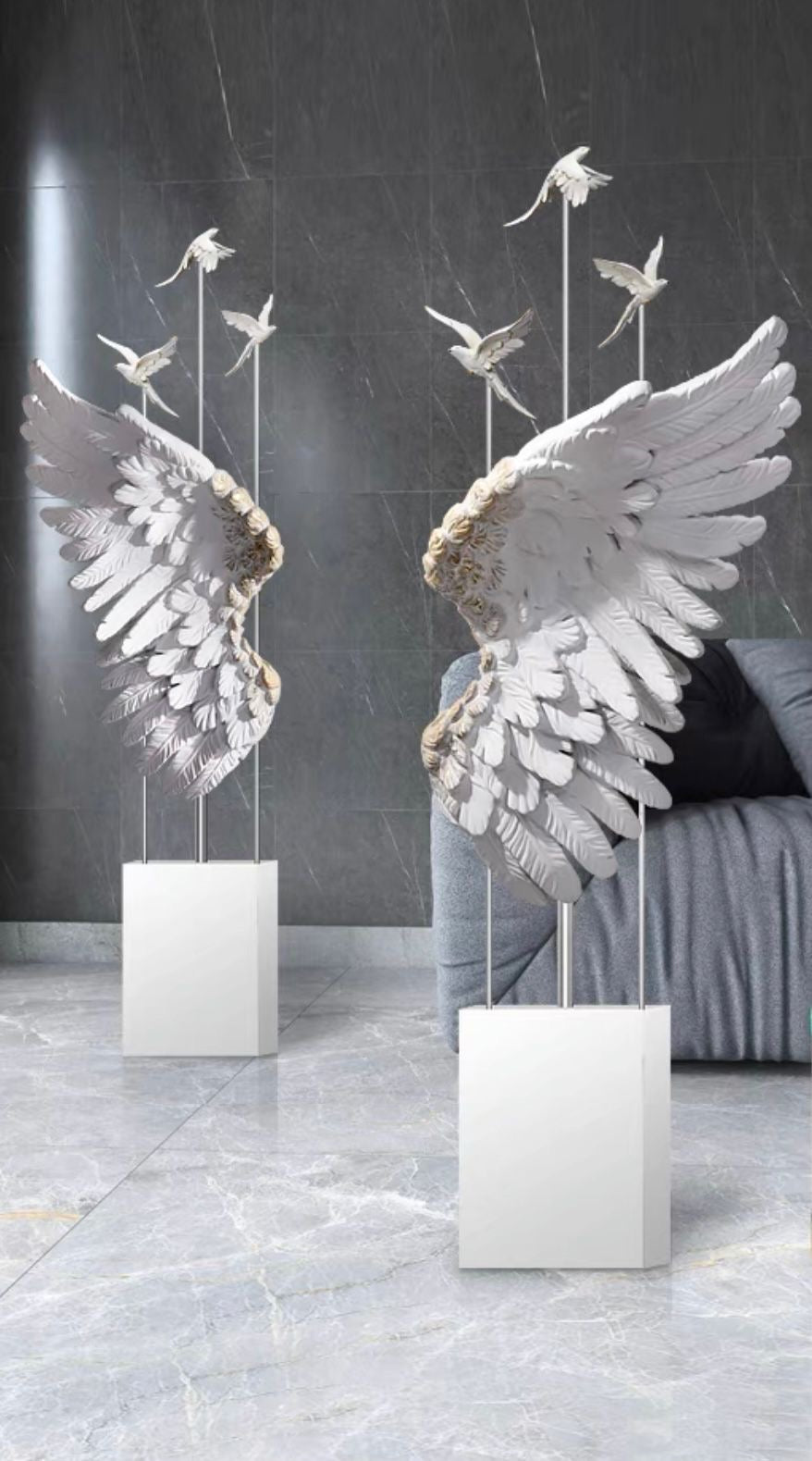 مجسم جناح ابيض مع زخارف ذهبية، مصنوع يدويًا من الألياف الزجاجية المعززة بالبوليمر، قاعدة خشبية قوية، مناسب لغرف المعيشة.