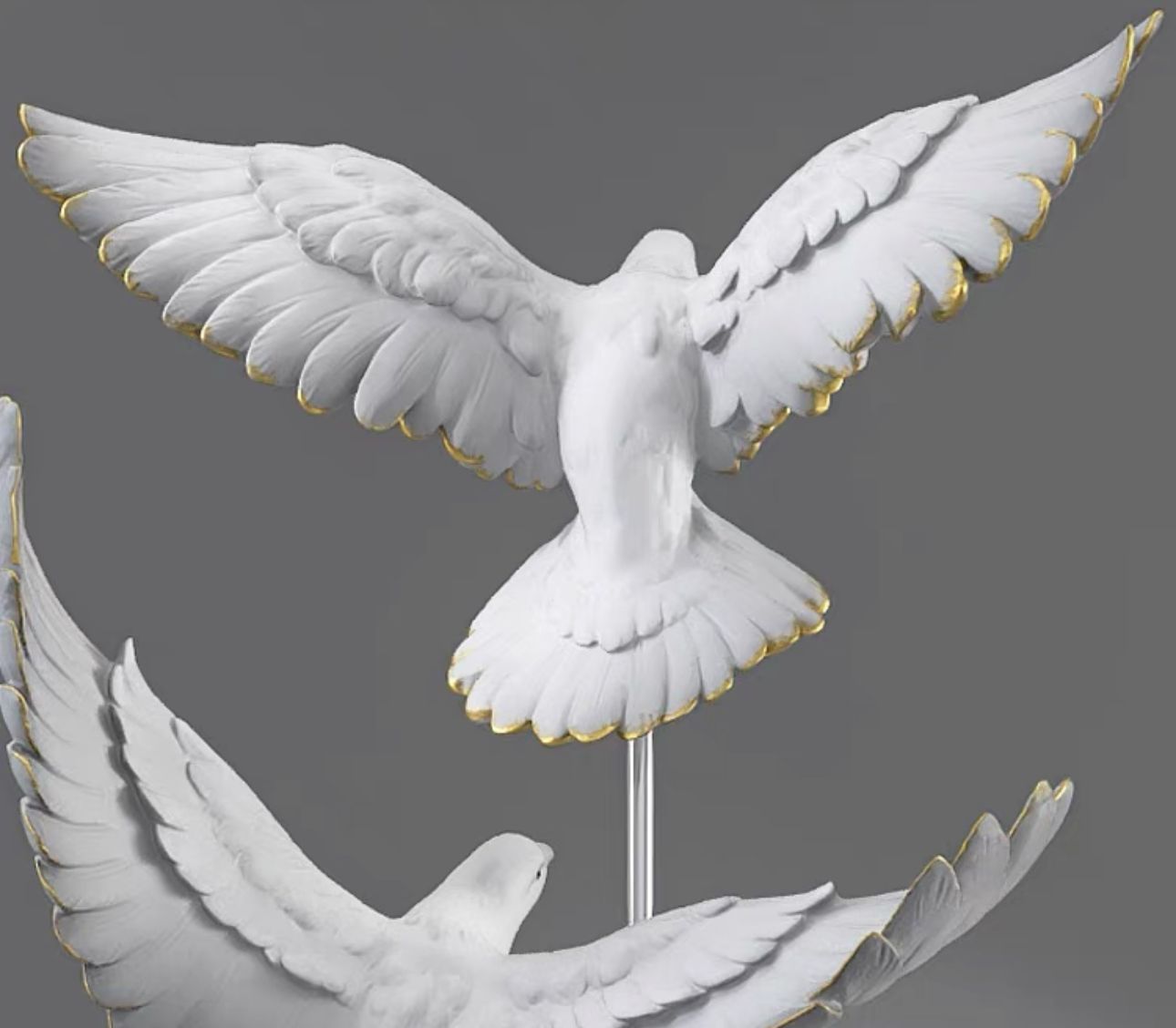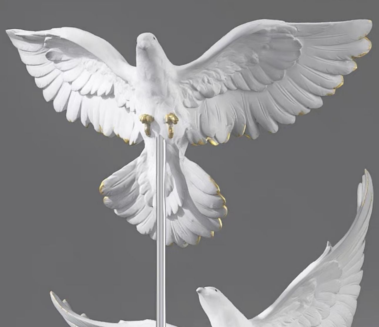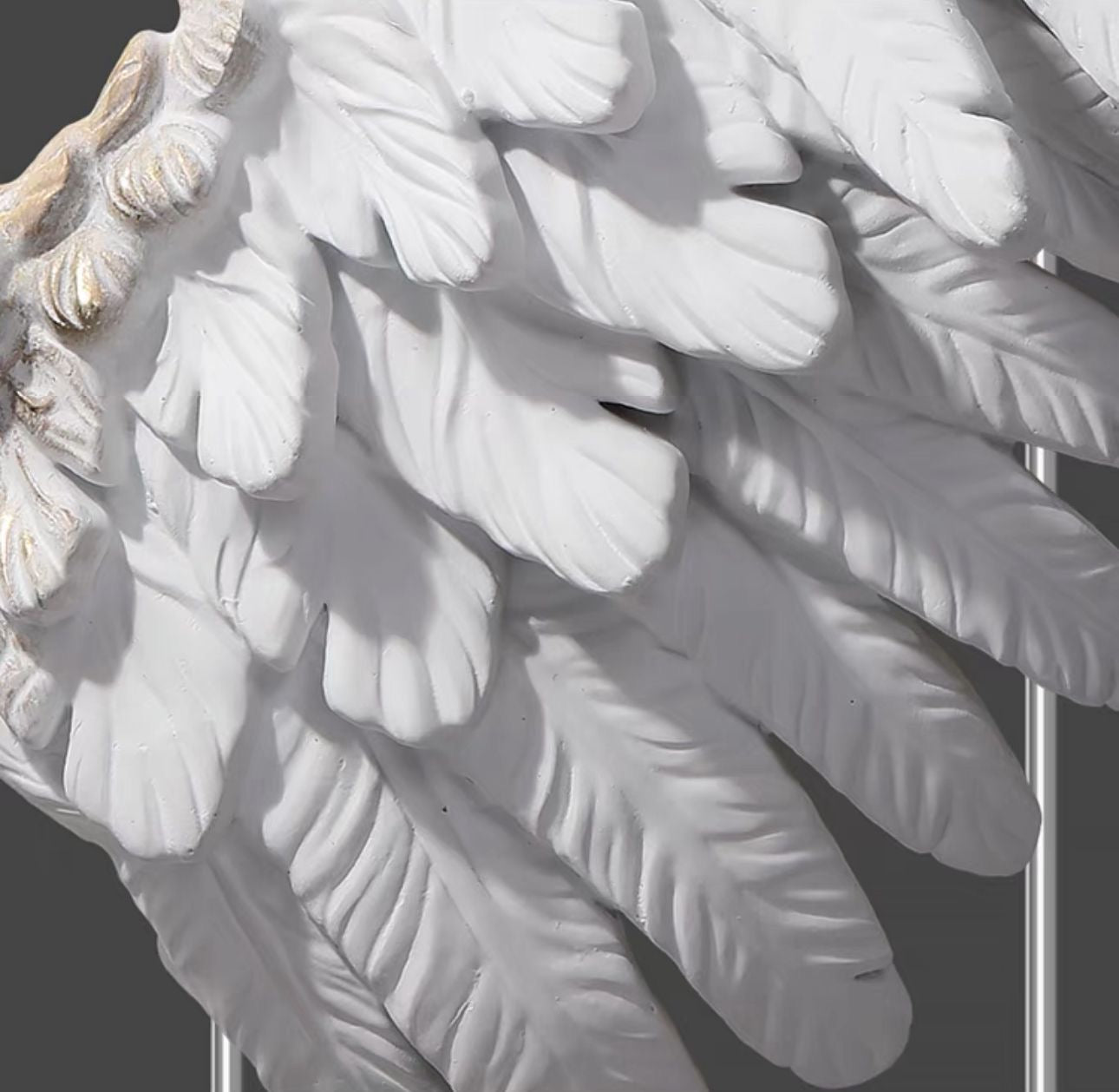 مجسم جناح ابيض مع زخارف ذهبية، مصنوع يدويًا من الألياف الزجاجية المعززة بالبوليمر، قاعدة خشبية قوية، مناسب لغرف المعيشة.