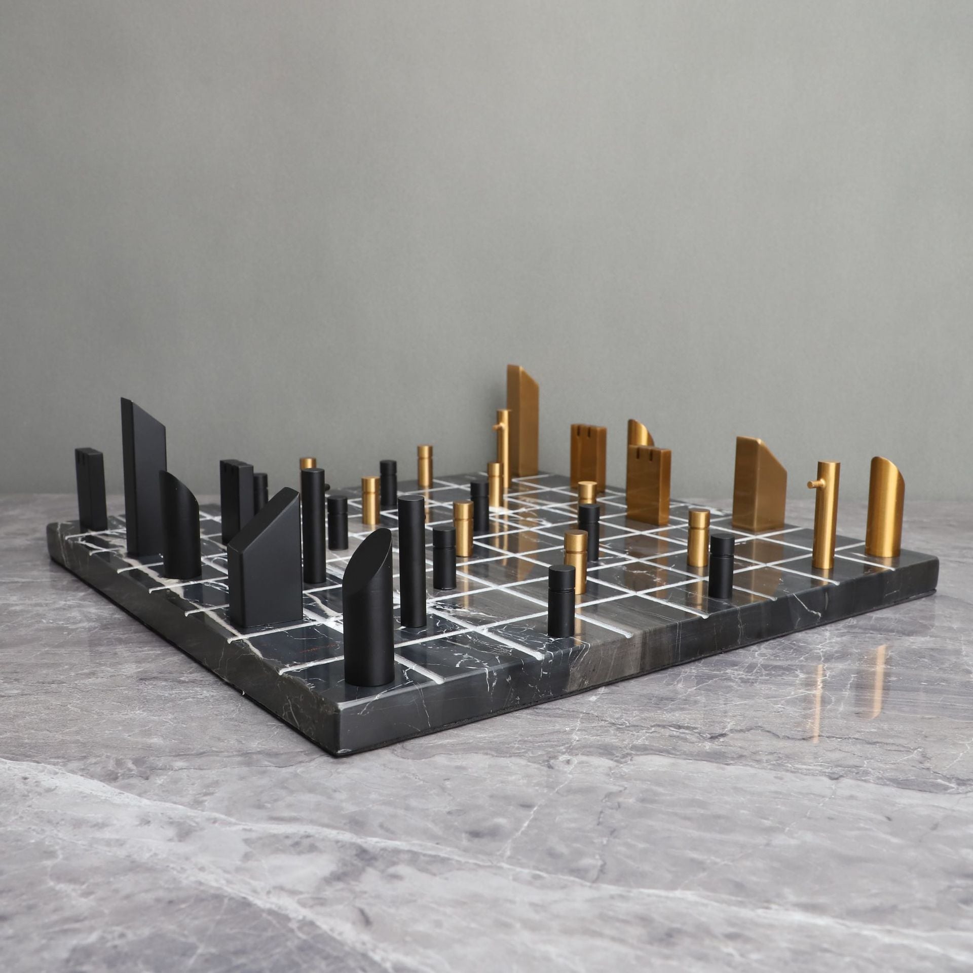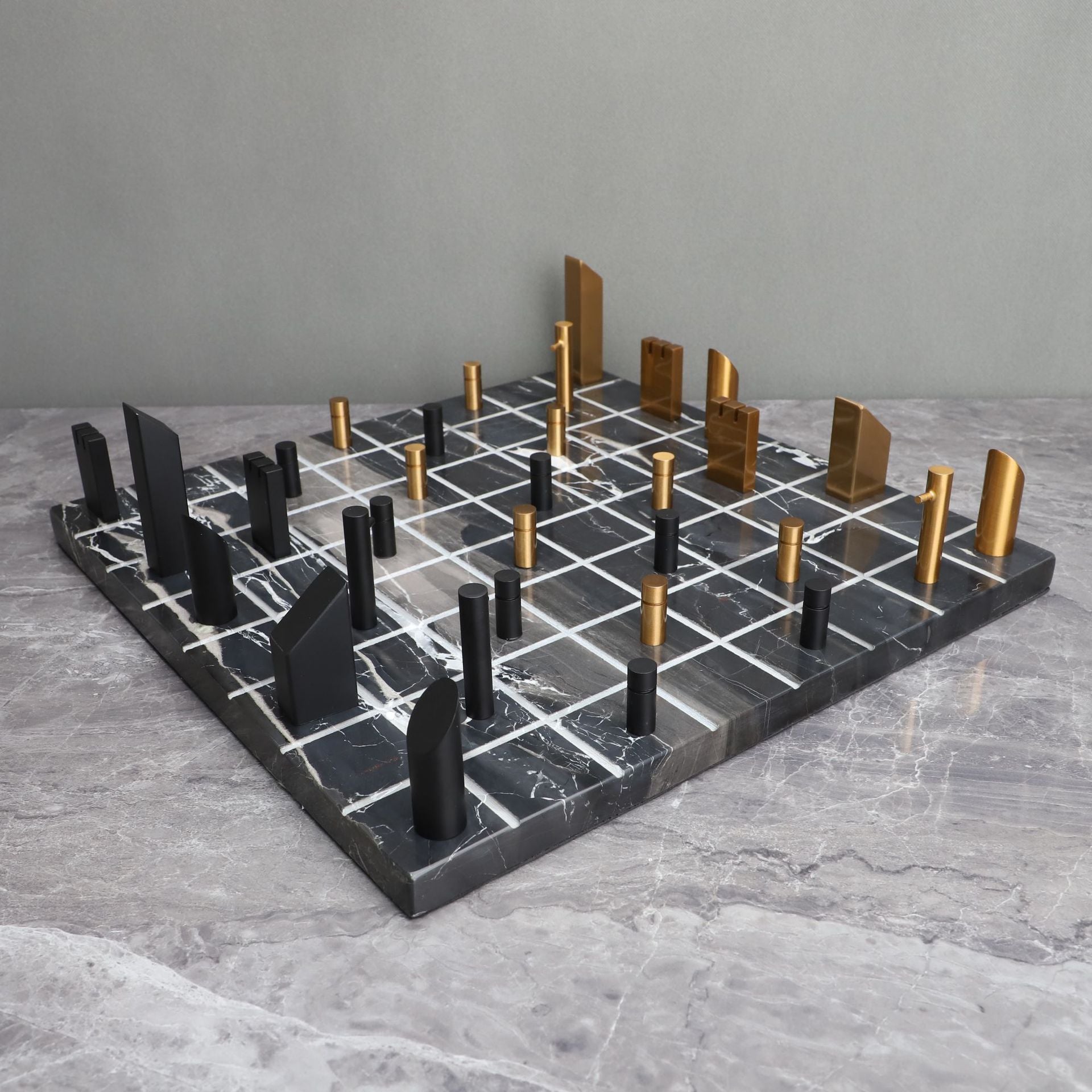 شطرنج مصنوع يدويا من النحاس الصب مع قاعدة رخامية, قطعة فنية فخمة باللونين الذهبي والأسود مناسبة للعرض كديكور وايضا للعب.