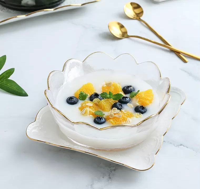 وعاء لتقديم الحلويات أو الشوربات يشمل على صينية زجاجية بها طبق تقديم وملعقة مصنوعة من البورسلين والزجاج لونها أبيض