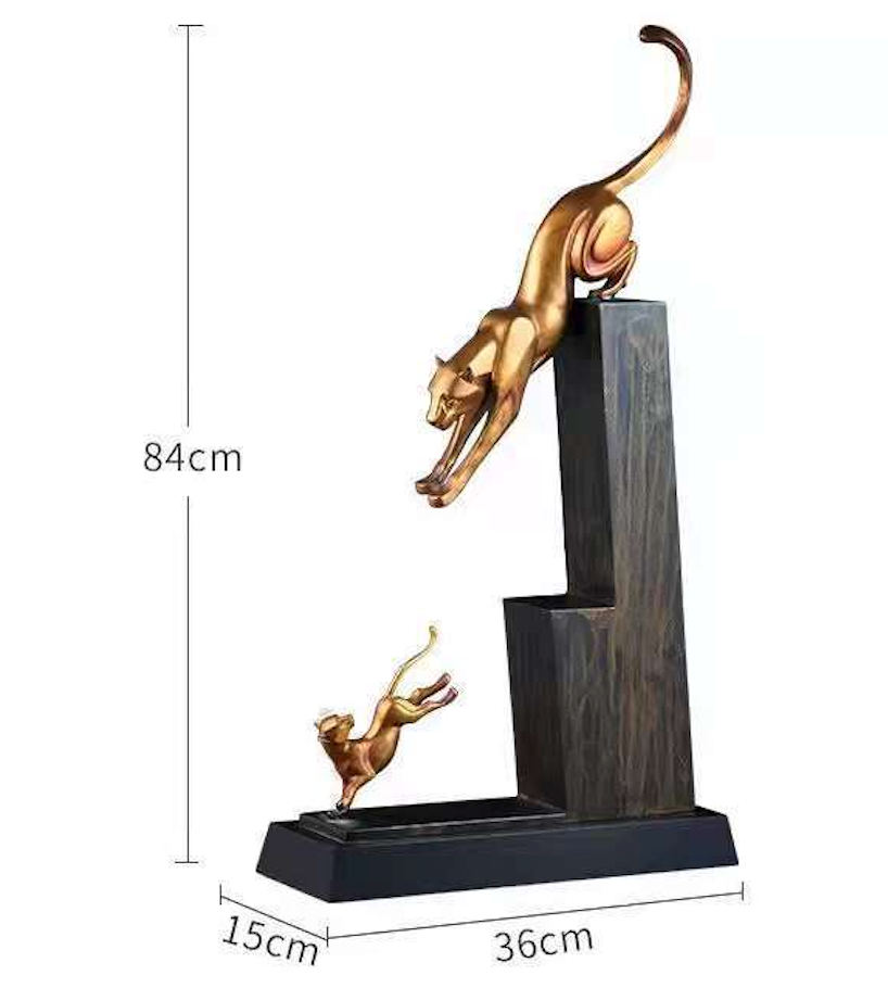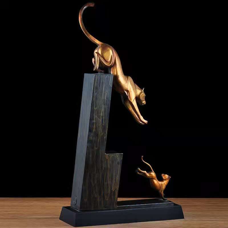 تمثال نحاسي يجسد جمالية الوثبة الرائعة لحيوان الفهد مع صغيره ، تحفة فخمة بحجم كبير ، صناعة يدوية متقنة.