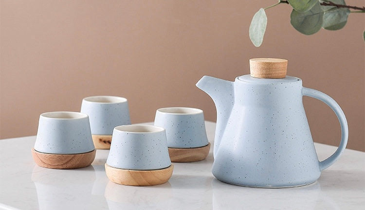 طقم شاي سيراميك ياباني بلون سادة ، طقم يشمل إبريق شاي ، 4 أكواب ، 4 قاعدة خشبية ، يدوي الصنع