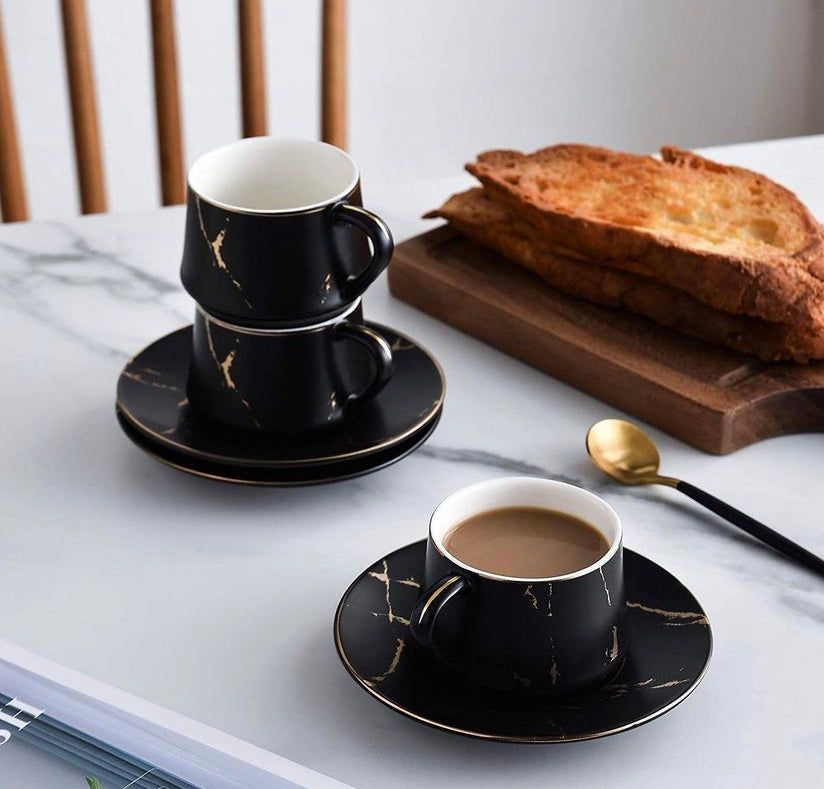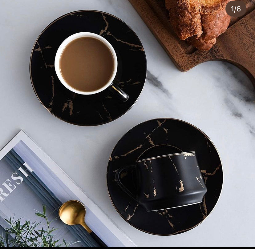طقم اكواب قهوة مصنوع يدويا من البورسلان بنمط الرخام المذهب ، يكفي ستة اشخاص ويشمل ( ستة اكواب ، ستة قواعد)