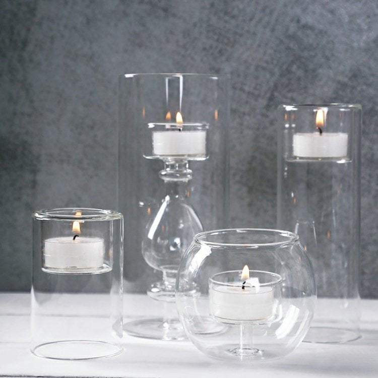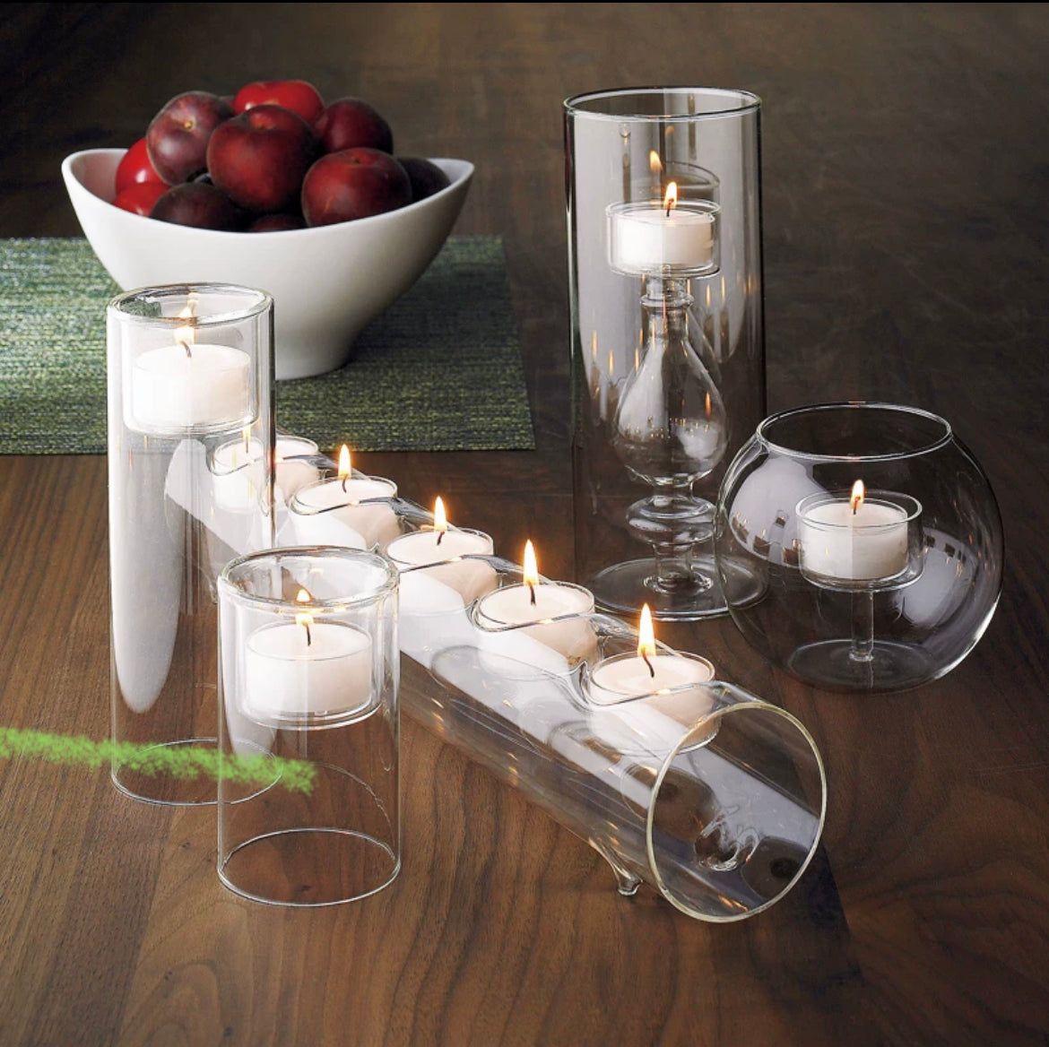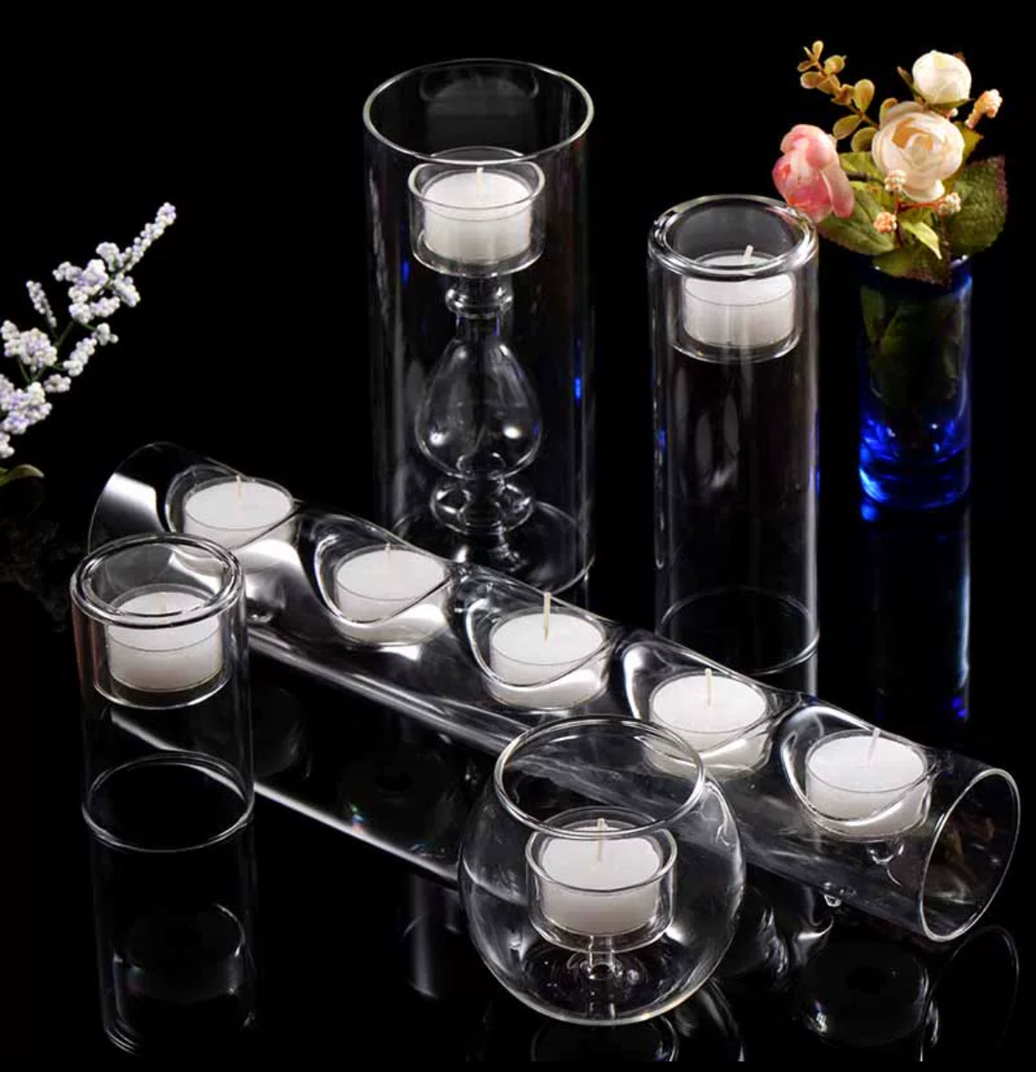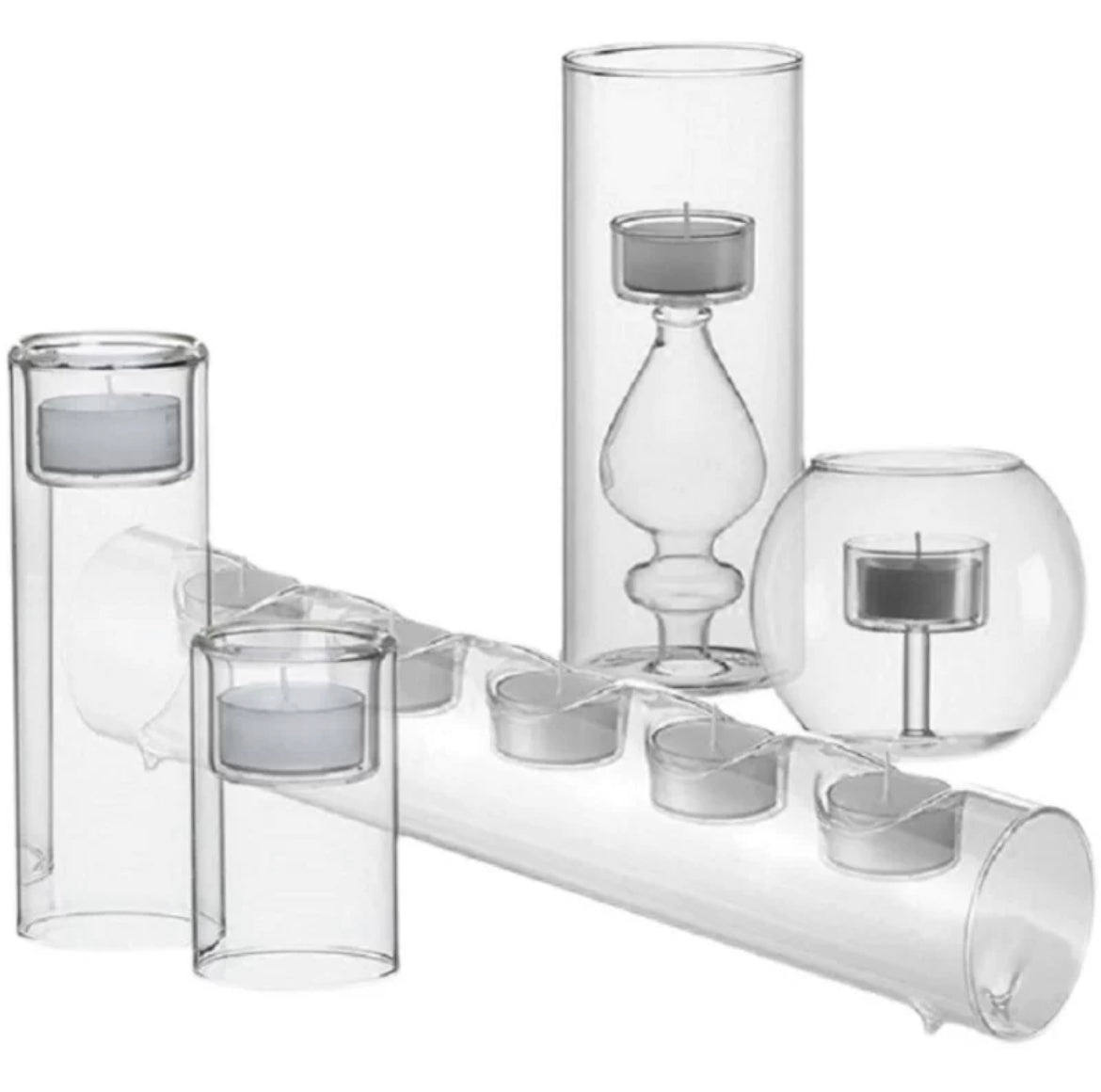 طقم شمعدانات مكون من خمس قطع متنوعة الاشكال والقياسات ، مصنوعة من الزجاج