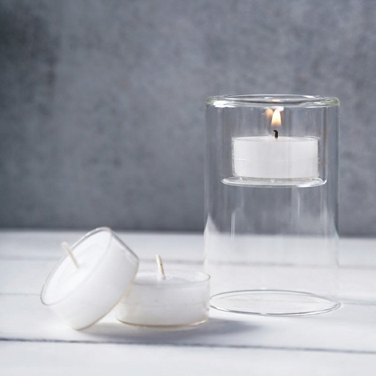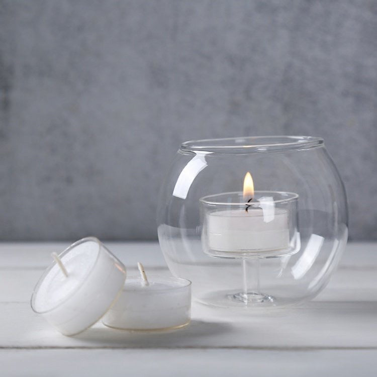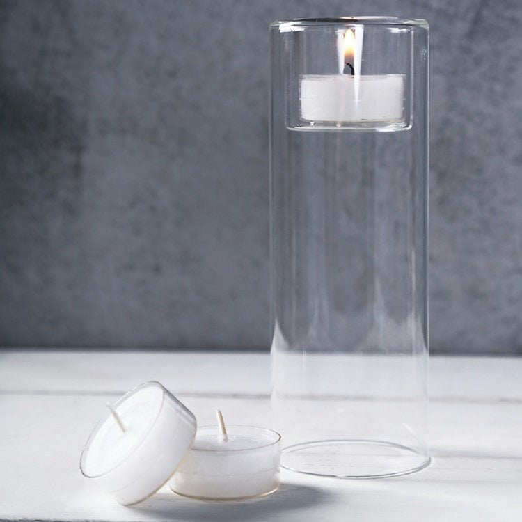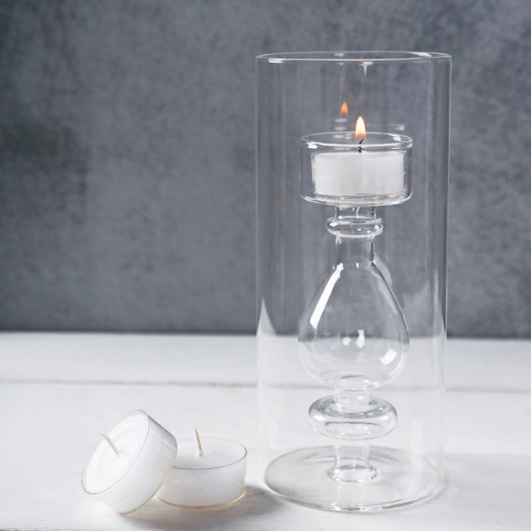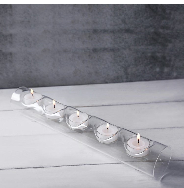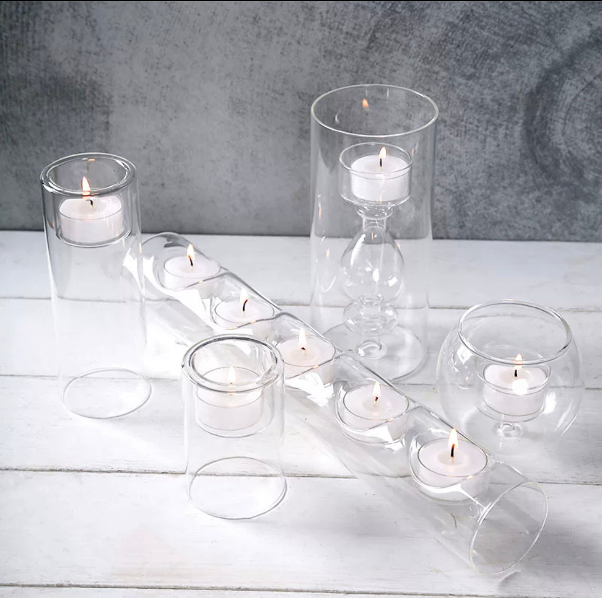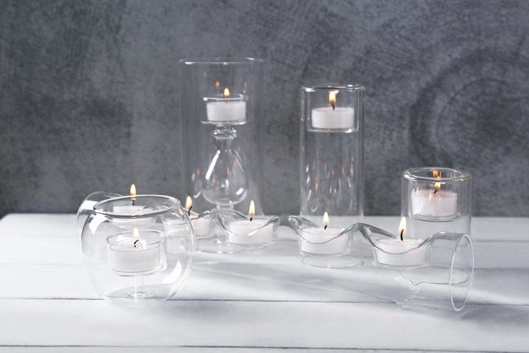 طقم شمعدانات مكون من خمس قطع متنوعة الاشكال والقياسات ، مصنوعة من الزجاج