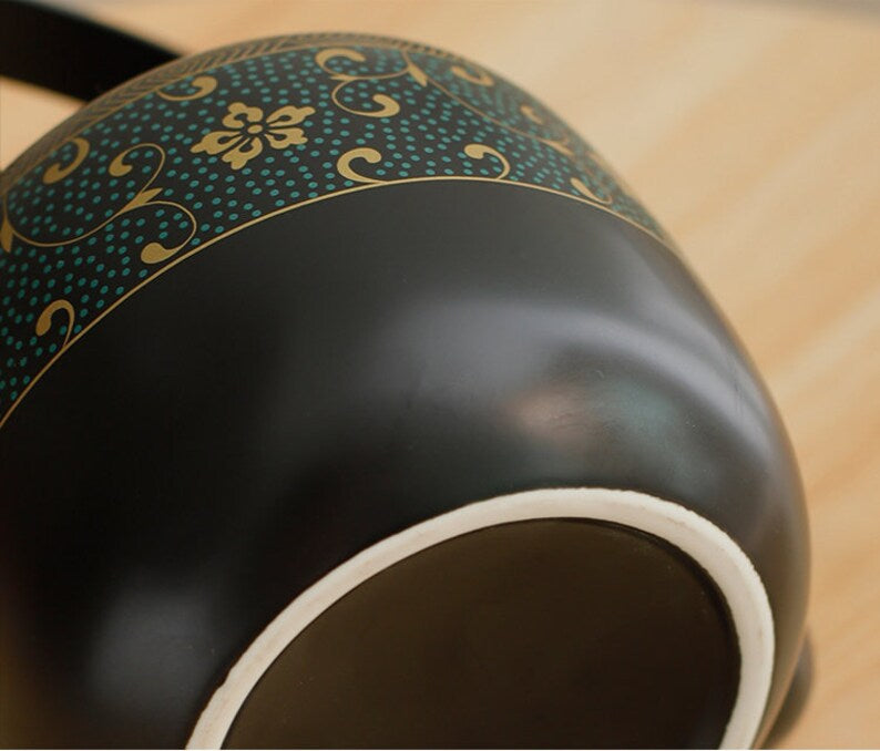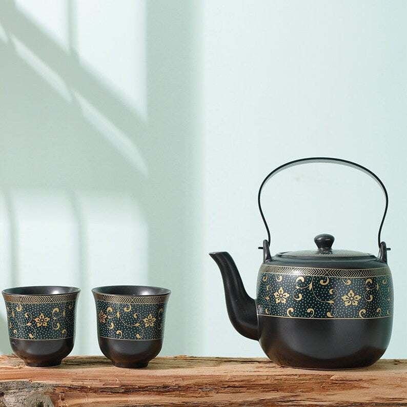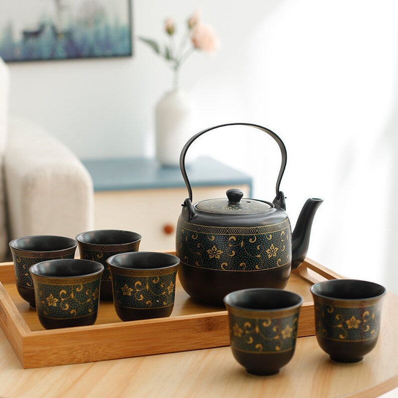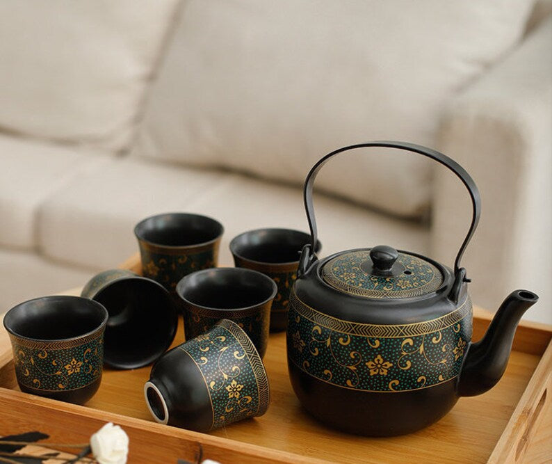 طقم الشاي او القهوة ، مصنوع من العضم الصيني ، مكون ابريق ٧٥٠ مل ، ستة اكواب وصينية تقديم خشبية مع فلتر تصفية للمياة ، نمط شرقي