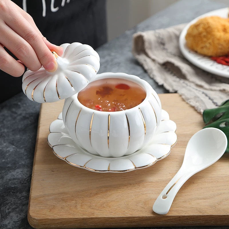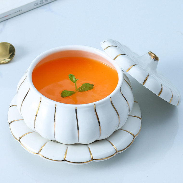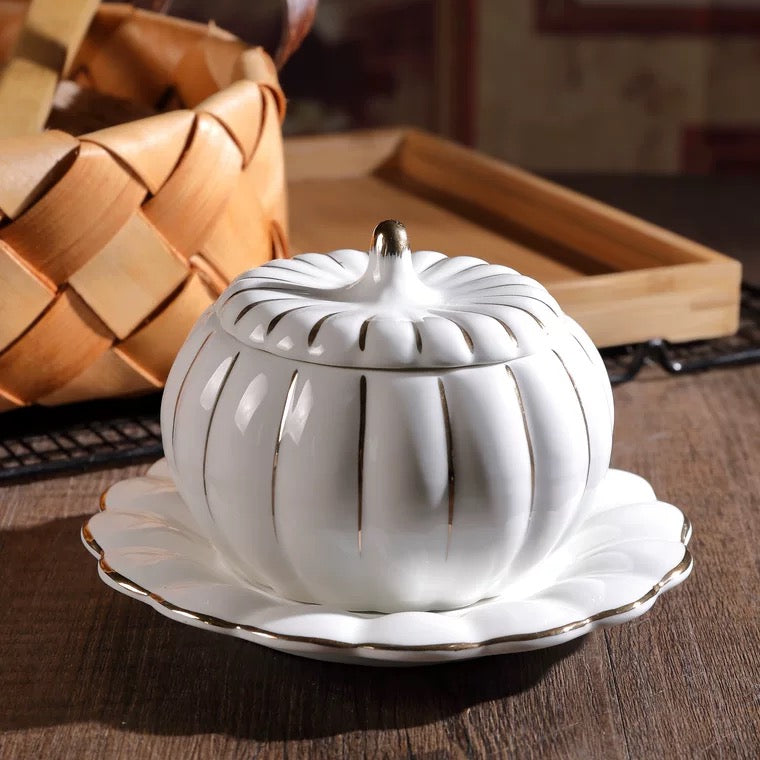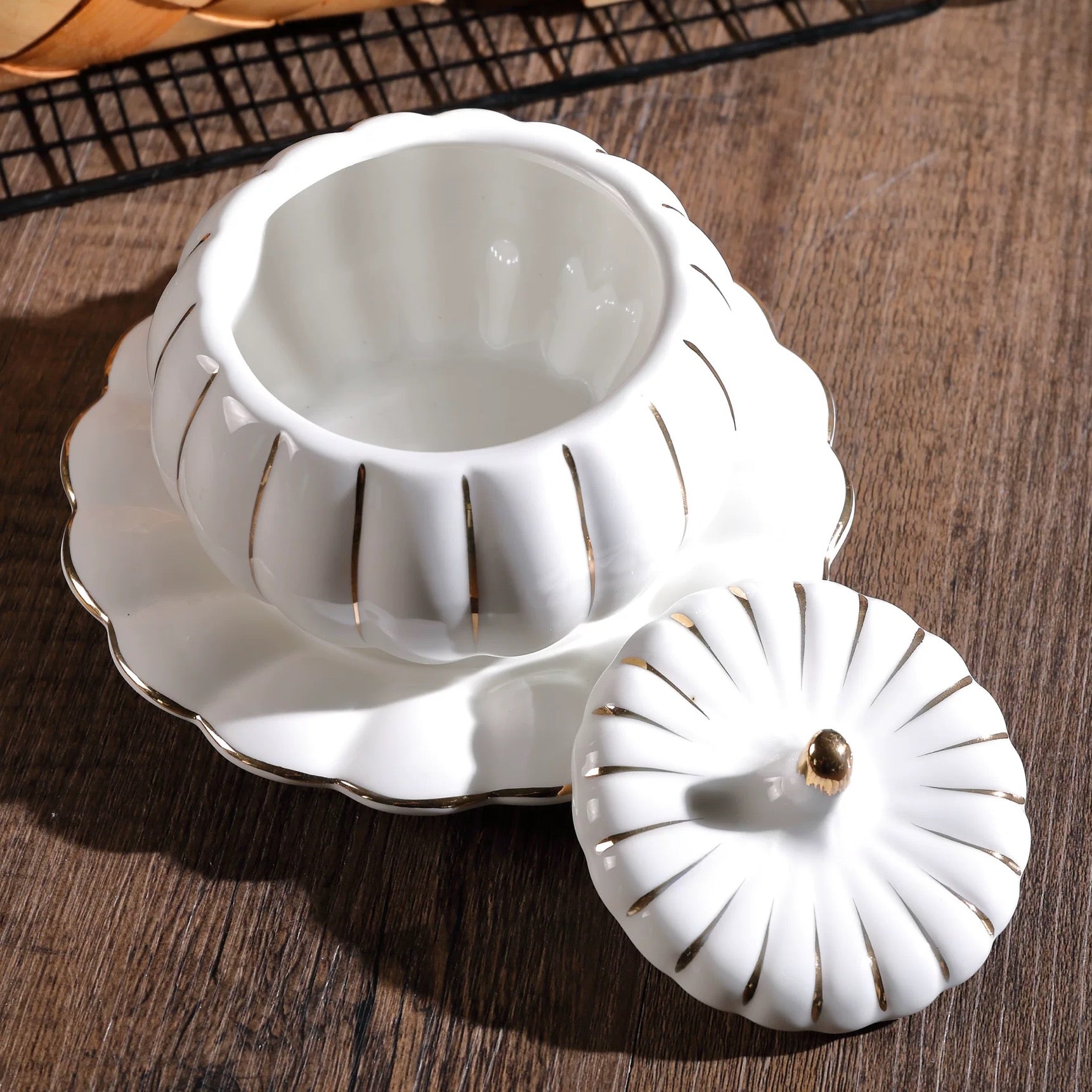 وعاء لتقديم الحلويات أو الشوربة مكون من صينية بشكل يقطينة بغطاء مع صحن تقديم وملعقة ، مصنوع من السيراميك ، اللون أبيض