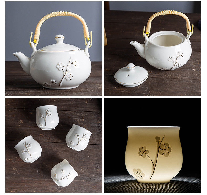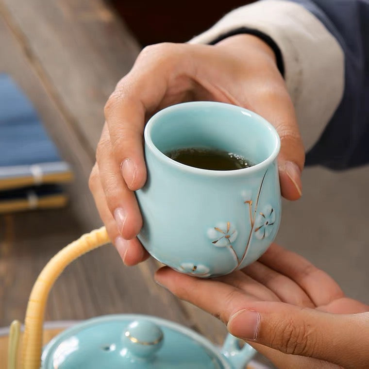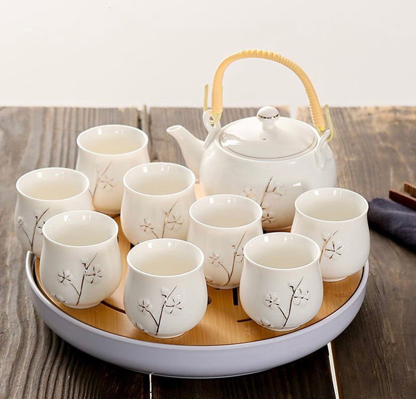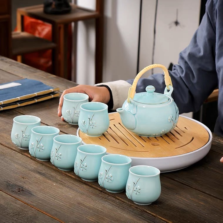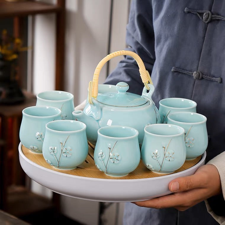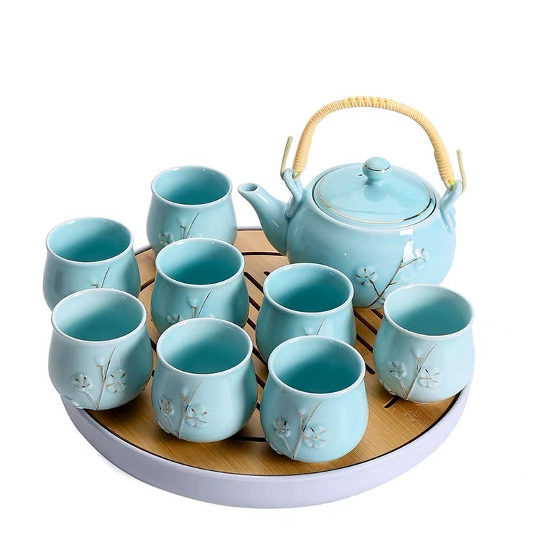طقم شاي أو قهوة ، مصنوع من البون شاينا ، بما في ذلك وعاء 750 مل ، ثمانية أكواب وصينية تقديم خشبية مستديرة ، لون الياقوت