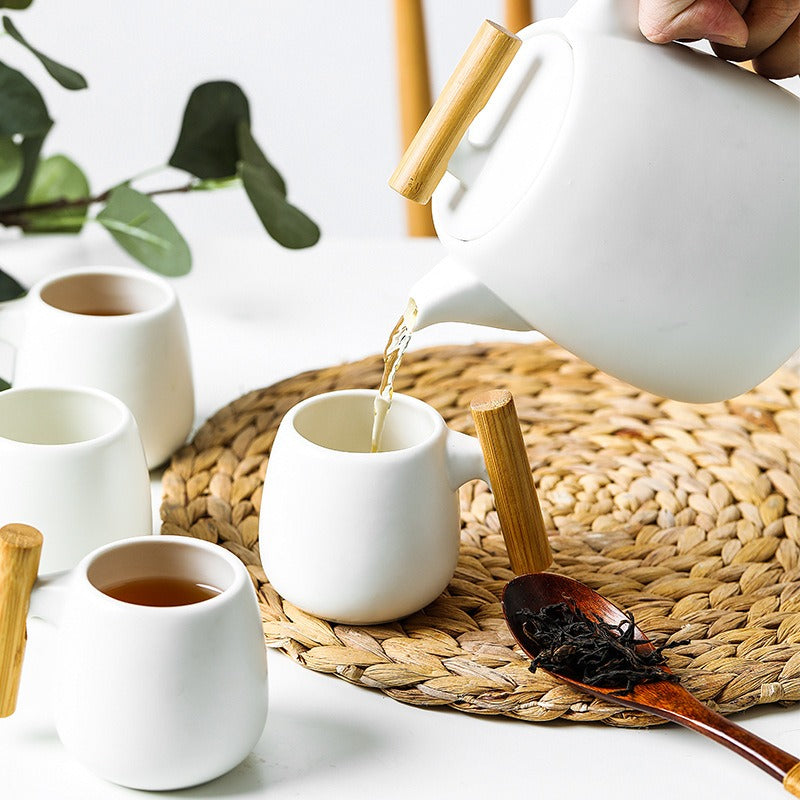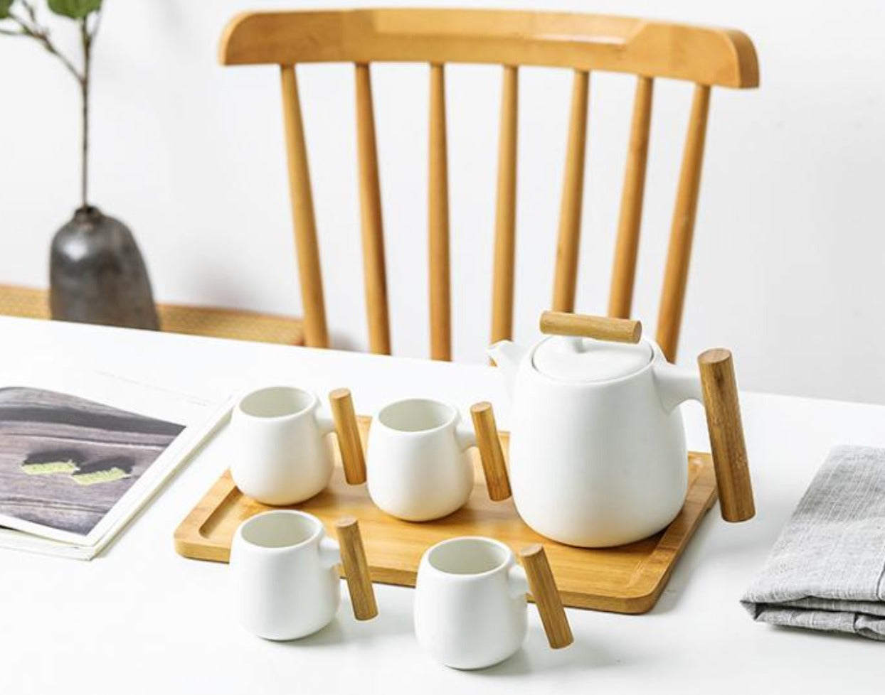 طقم شاي عصري بسيط على الطريقة اليابانية ، يتضمن الطقم إبريق شاي وأربعة أكواب وصينية مصنوعة من السيراميك.
