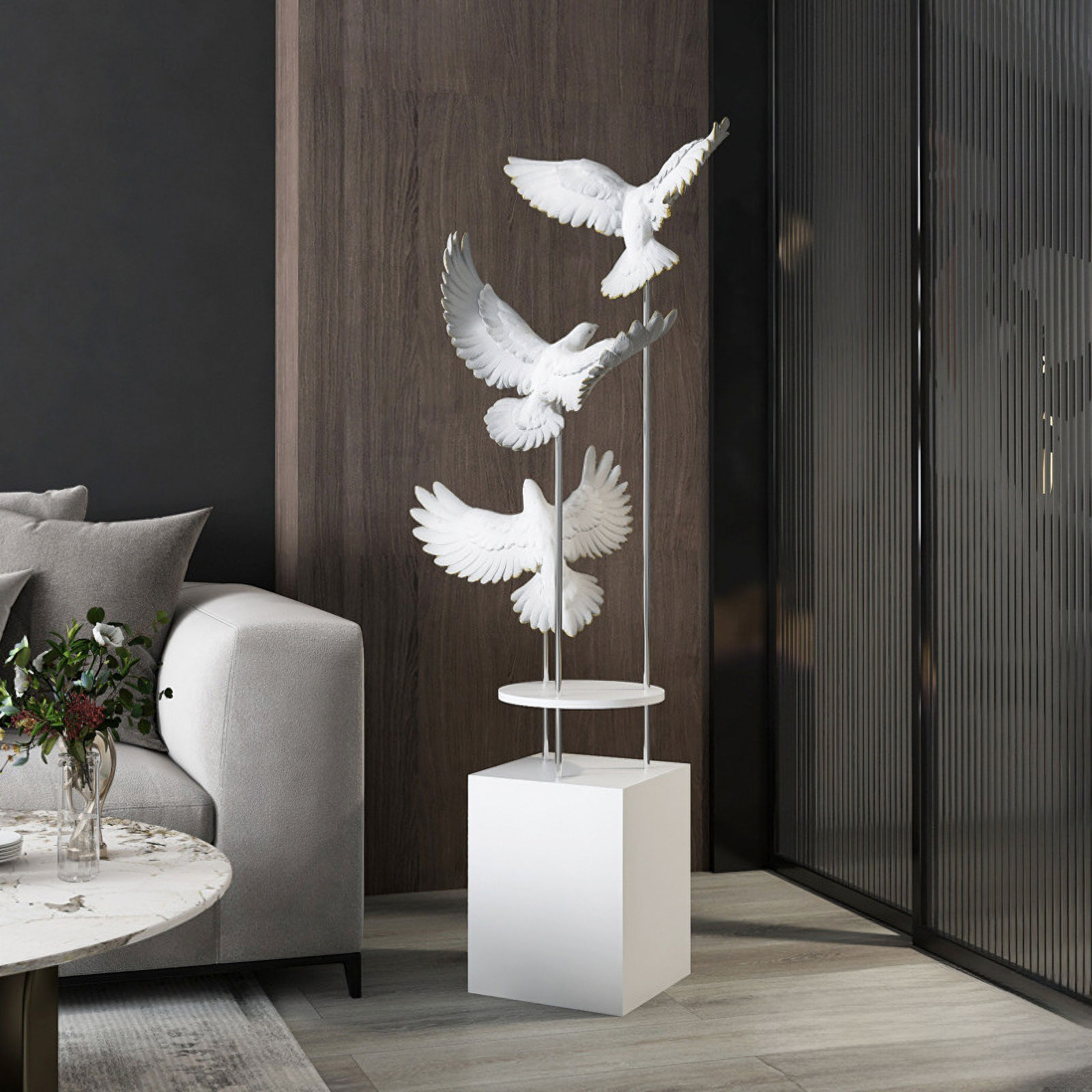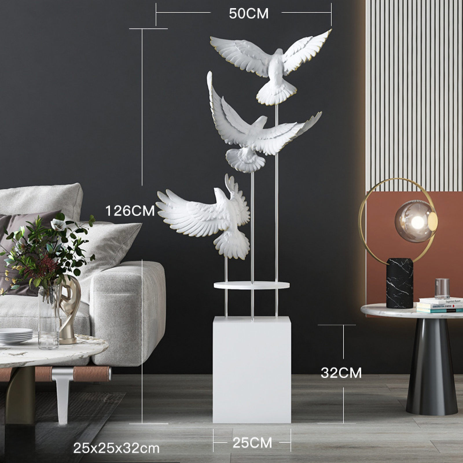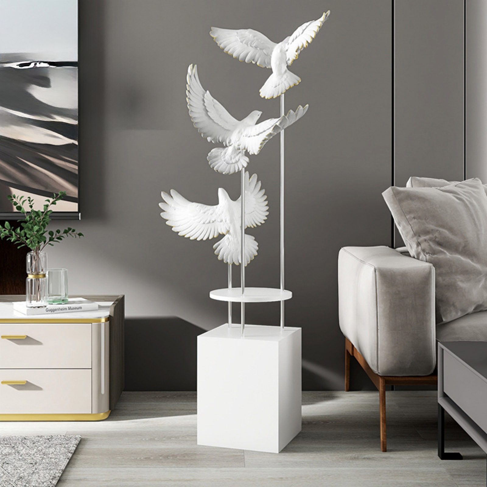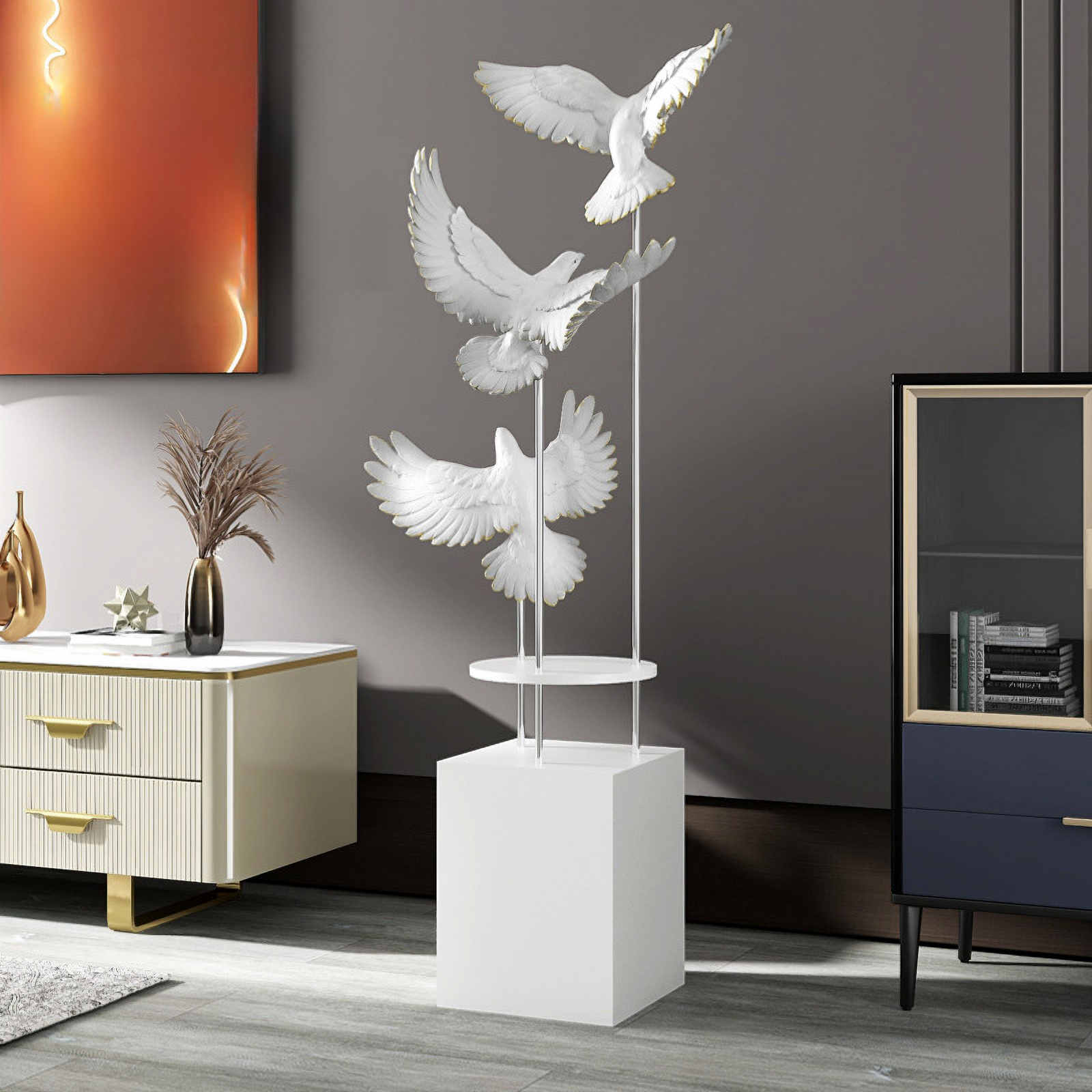 مجسم الطيور المحلقة باللون الأبيض مع رتوش ذهبية ، مصنوع يدويا من الالياف الزجاجية المعززة بالبوليمير ، قاعدة خشبية متينة ، مناسب لغرف المعيشة.