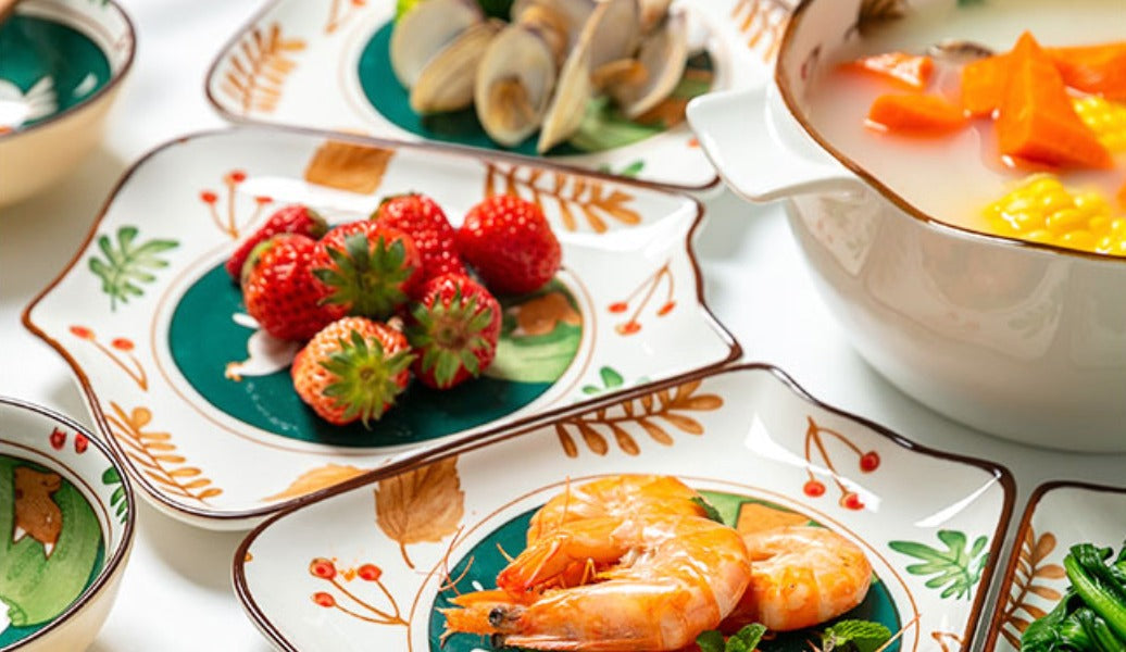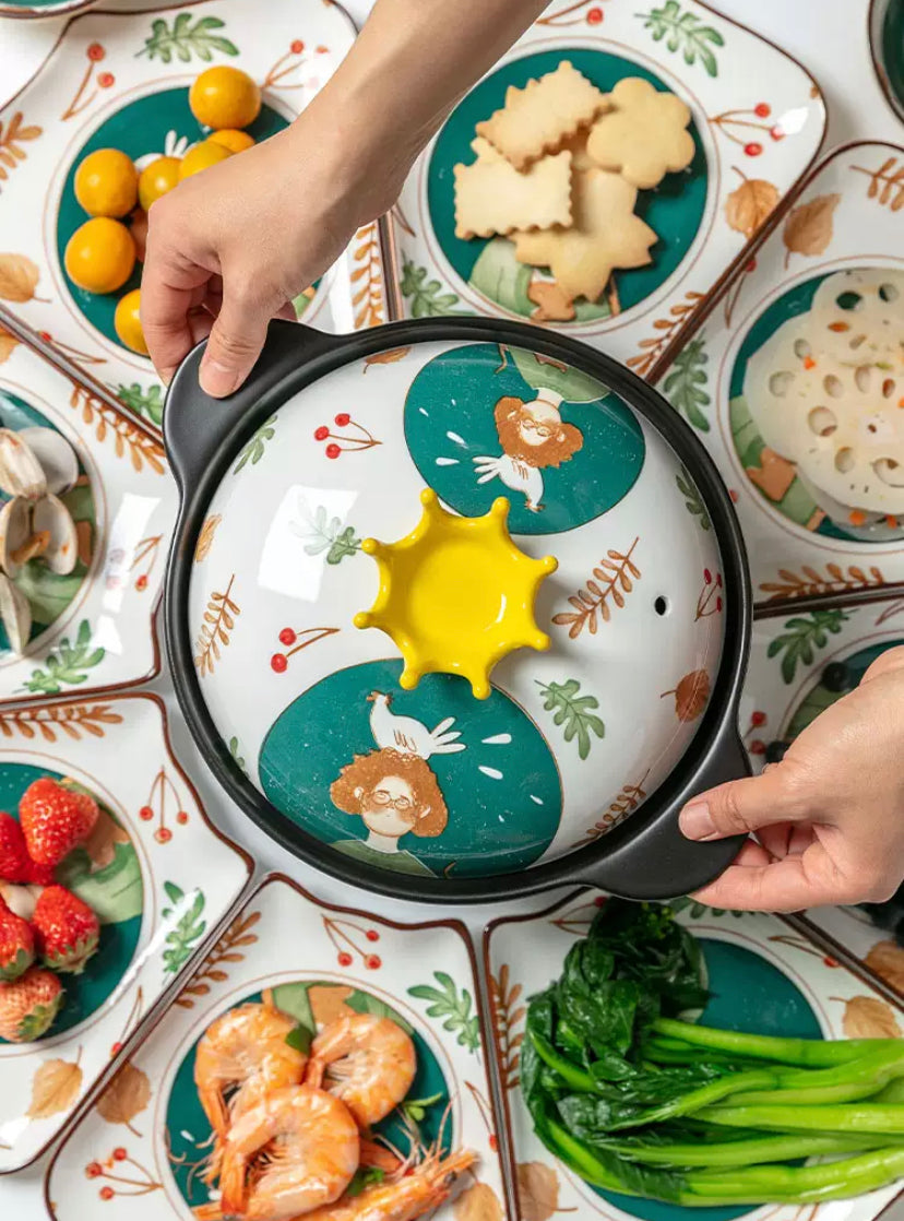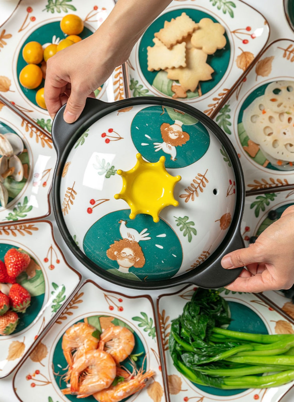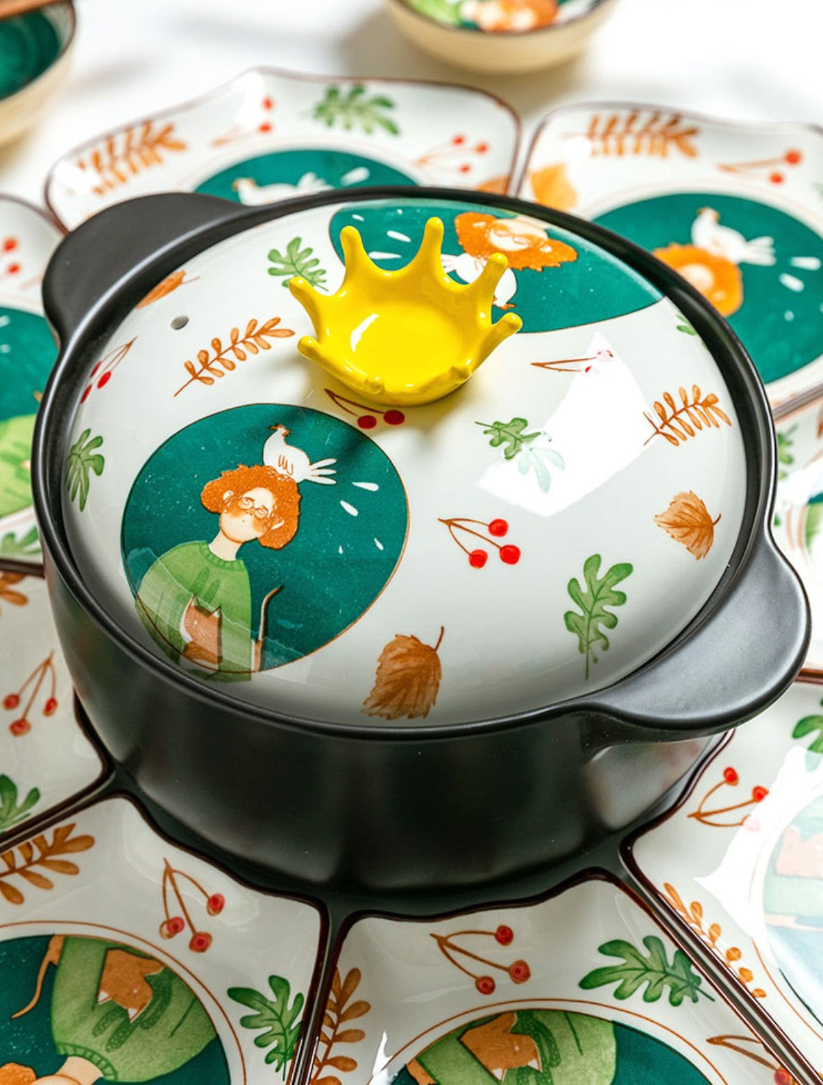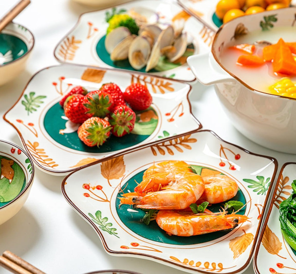 طقم المائدة، طقم مكون من 8 قطع مع كسروله مركزيه على الطريقة اليابانية مصنوعه من البورسلين بطراز ريفي جميل.